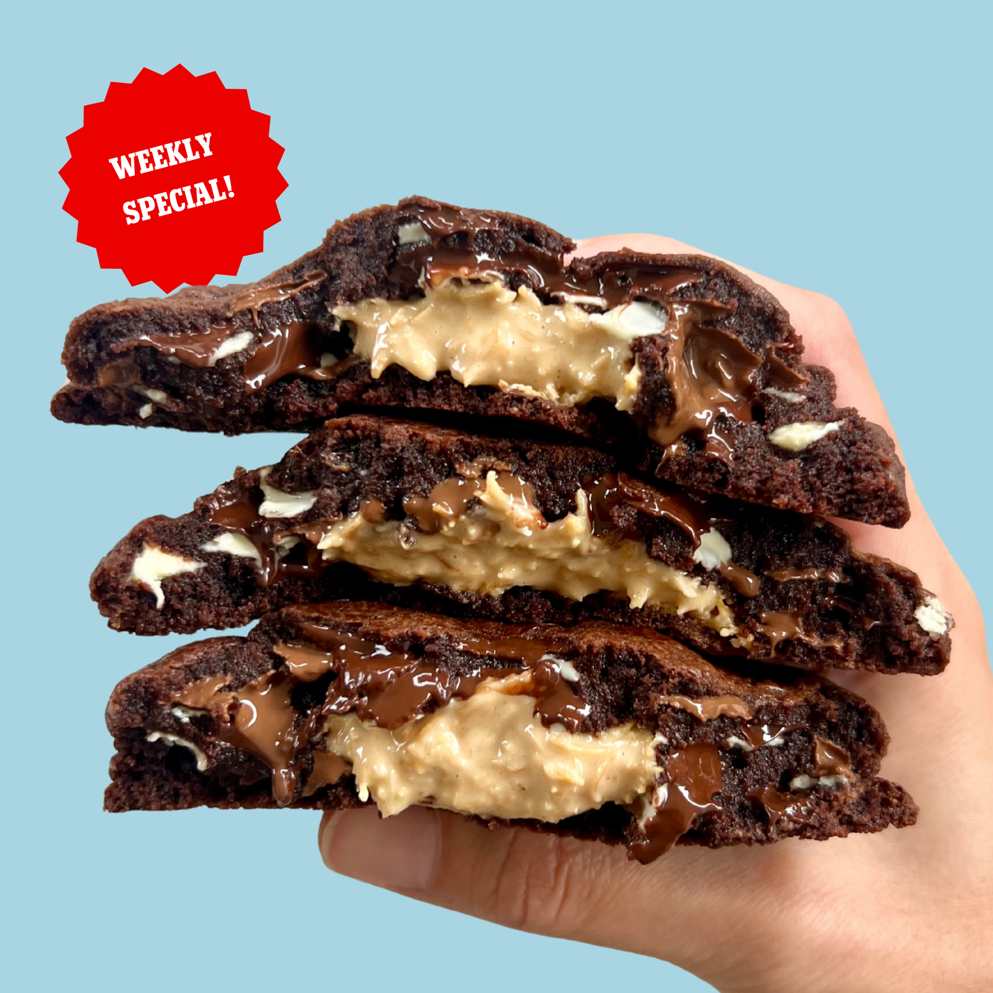 Our rich chocolate cookie base, loaded with the perfect mix of creamy milk, dark & white choc chips, and stuffed with a CREAMY BUENO & CRUNCHY KATAIFI centre.